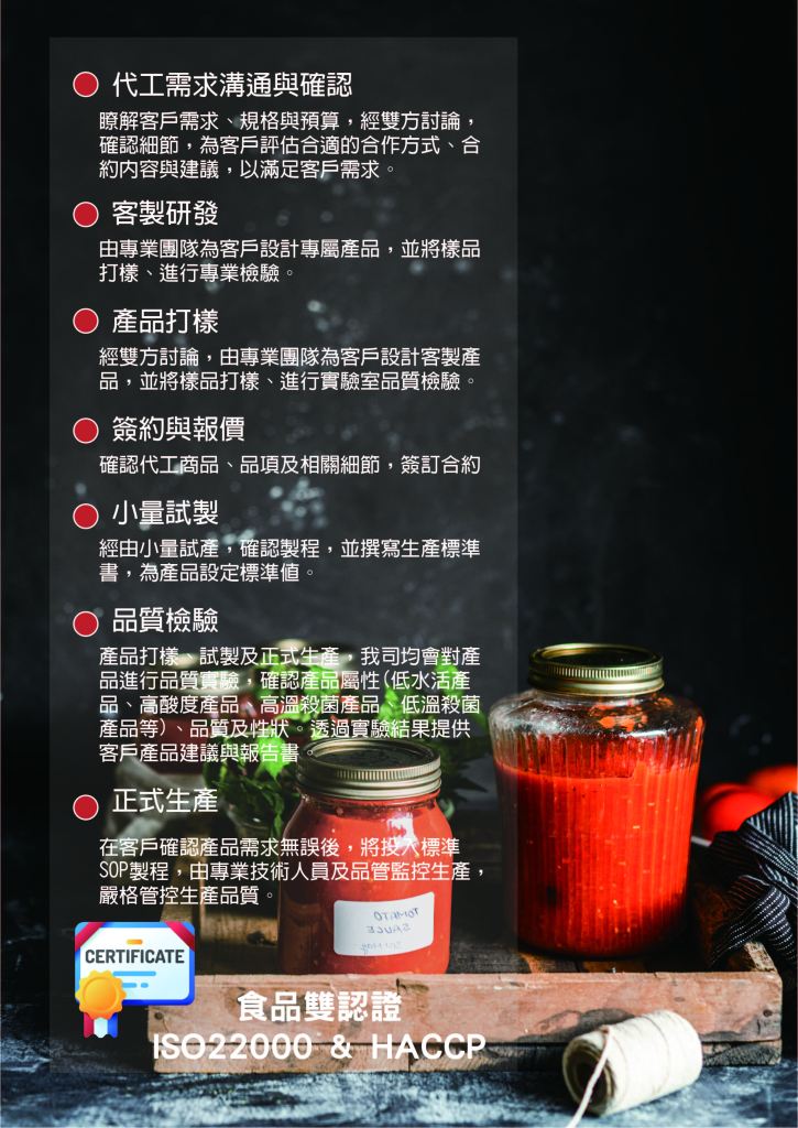 富達食品有限公司擁有豐富的食品代工經驗,通過HACCP、ISO22000系統雙驗證,專業研製團隊、品質實驗室與品管專員,從研發客製調味、品質檢驗到生產、包裝的OEM、ODM醬料代工,幫您嚴格把控產品品質!